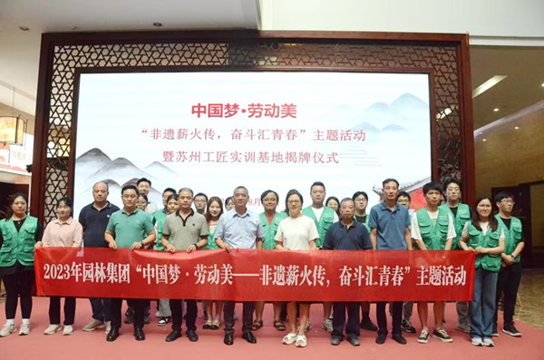 2023年8月25日,为大力弘扬劳模精神、劳动精神、工匠精神,传承香山帮传统建筑营造技艺,“中国梦·劳动美——非遗薪火传,奋斗汇青春”主题活动暨苏州市工匠实训基地揭牌仪式在园林股份隆重举行。活动由苏州园林集团主办、园林股份公司承办,激励香山传承人打造香山帮传统建筑营造技艺人才培养平台,持续擦亮“苏州园林”“香山工匠”金字招牌。