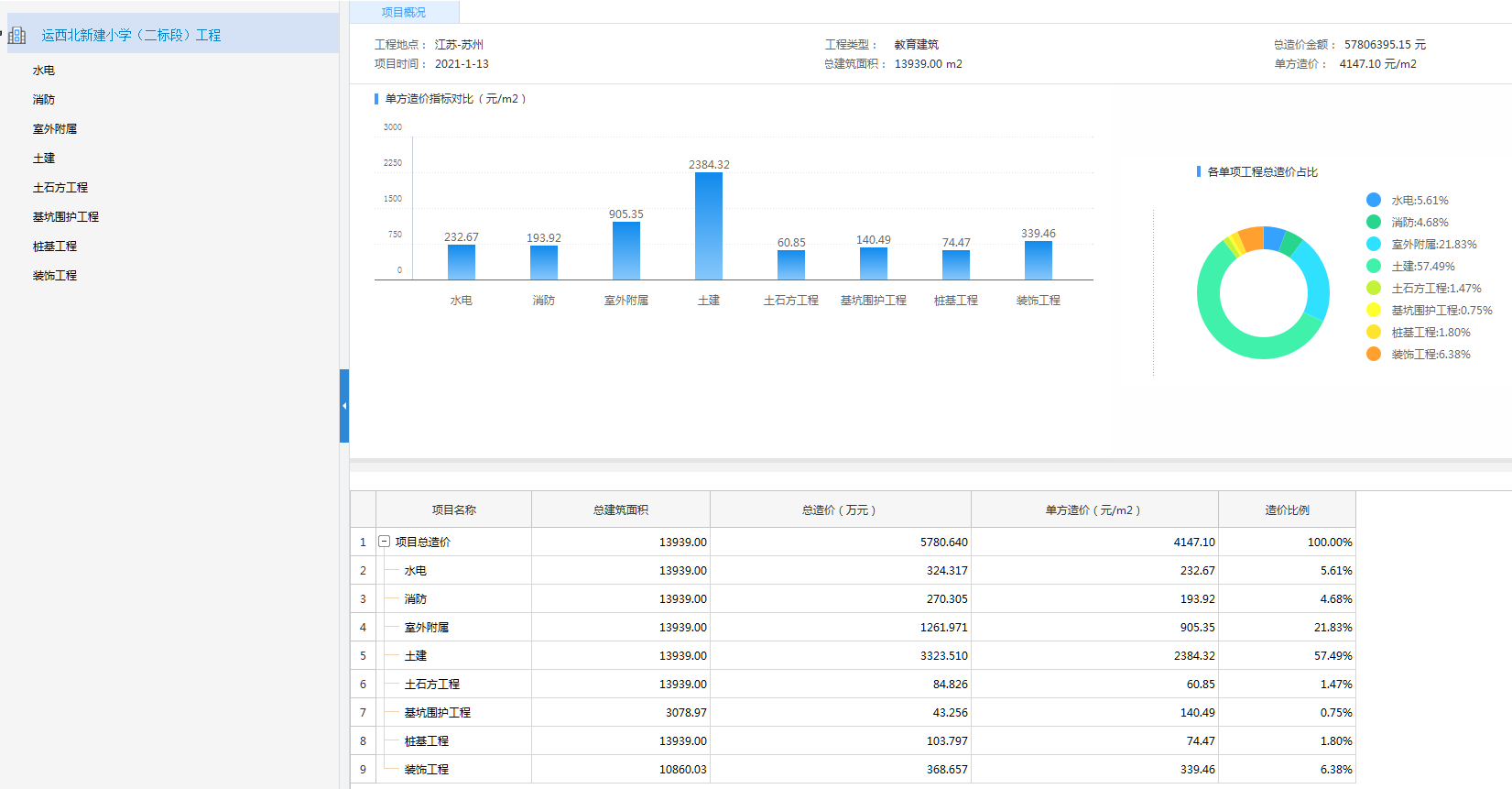 图1为导入后本工程总体指标界面,是根据左侧的专业分类进行的各专业的单方造价指标的计算结果。点击左侧的各专业分类,可以查看各专业更为详细的分部分项指标,如图2 所示。