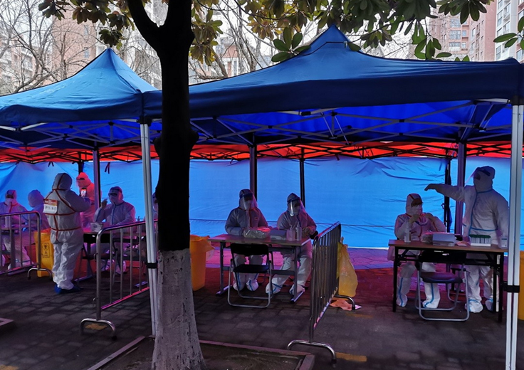 志愿者们分工明确,查看苏康码,维护排队秩序,检测区门口把关放人,场内维护秩序,场内扫身份证,场内掰棉签封管,场内核酸取样,场内消杀,场内物资后勤,场内联络人员…但是计划再周密和实际还是会有差距。原先预安排6个检测点的临时变成7个检测点,点长作为整个场控核心,随时进行物资和人员调配。比如平台卡顿,一边向上反馈平台速度慢,一边向下及时传达现场最新的状况信息,大喇叭不停地播平台卡顿,大家耐心等待,不急的下午再来检测,业主群里同步发群信息,另外实时短信通知业主。